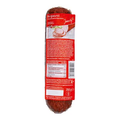 Die Bergwurst von Jeden Tag bietet dir 350g fein geräucherten Genuss aus Schweinefleisch, Rindfleisch und Speck. Mit einer harmonischen Gewürzmischung und einem Hauch von Rauch verfeinert, ist sie ideal für Brotzeiten oder als herzhafter Snack. Perfekt für alle, die Qualität und Geschmack schätzen.