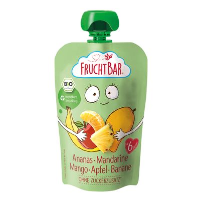 Zutatenliste Pürierter Apfel* (47%), pürierte Ananas* (15%), pürierte Mango* (15%), pürierte Banane* (15%), Mandarinensaft* (8%)