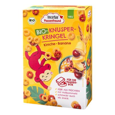 Knusper Kringel von FRUCHTBAR sind der perfekte Snack für Kinder. Mit 48% Weizenvollkornmehl und 21% Apfelsaftkonzentrat sorgen sie für einen köstlichen, fruchtigen Geschmack von Kirsch und Banane. Die Zutaten sind ohne Gentechnik und bieten eine gesunde Knabberei. Ideal für den kleinen Hunger zwischendurch!