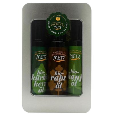 Hochwertige, genussvolle Bio-Öle in der attraktiven Geschenksbox – ein besonderes Präsent für bewusste Genießer! Mit der Bio-Ölvielfalt schmeckt der Salat jeden Tag anders. Das Bio-Kürbiskernöl wird nach der traditionellen Methode gepresst – herrlich nussig aus Erstpressung, 100% reines Hanföl - grasig, grün nach Heublumen , Bio-Rapsöl – da schmeckt man die natürlichen Senföle noch richtig heraus!