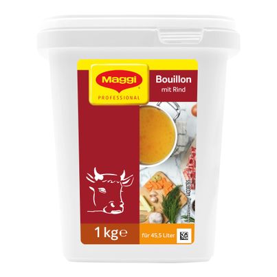 Die Bouillon mit Rind von Maggi verleiht deinen Gerichten eine kräftige Note. Perfekt zum Würzen von Suppen, Braten oder Saucen. Mit 4,5% Rindfleischpulver und ausgewählten Gewürzen wird jedes Gericht zum Geschmackserlebnis. Einfach in heißem Wasser auflösen und genießen. Ideal für kreative Küchenideen.