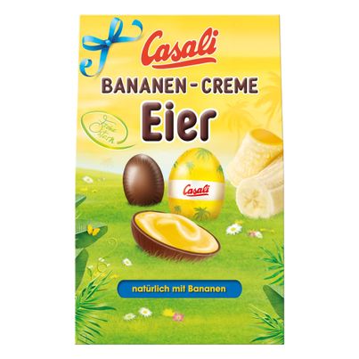 Casali Bananen-Creme Eier bieten dir ein einzigartiges Geschmackserlebnis. Die zarte Schokoladenhülle umschließt eine cremige Bananenfüllung, die mit echtem Bananenfruchtpulver verfeinert ist. Perfekt für den kleinen Genussmoment zwischendurch. Lagere sie trocken und bei Zimmertemperatur, um die Frische zu bewahren.