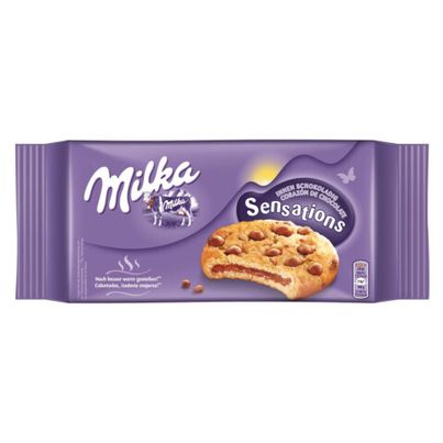 Milka Cookies Sensations Schokoladig bieten dir ein unwiderstehliches Geschmackserlebnis. Der knusprige Keks mit zarten Alpenmilch-Schokoladenstückchen und einer cremigen Milchschokoladenfüllung lässt Schokoladenherzen höherschlagen. Perfekt für den süßen Genussmoment zwischendurch.