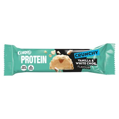 Entdecke den Corny Protein Riegel Vanilla & White Choc! Fein-würziges Vanillearoma, knackige Haselnüsse und cremige Proteinfüllung in einem Riegel vereint. Weiße Schokolade mit Süßungsmittel, MILCHEIWEIß, SOJAEIWEIß, geröstete HASELNÜSSE und mehr. Perfekt für unterwegs!