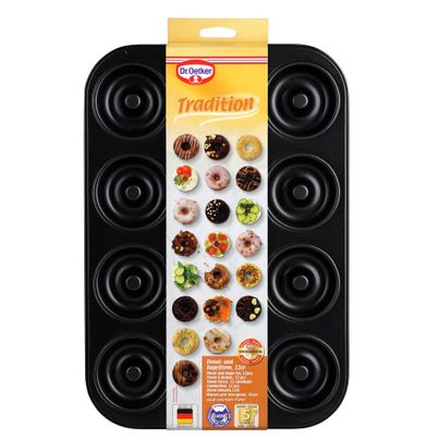 Donutform für 12 gleichmäßig geformte Donuts oder leckere Bagels im Handumdrehen: Die Dr. Oetker Donutform Tradition 12er aus hochwertigem Stahl sorgt für eine gleichmäßige Wärmeverteilung und optimale Backergebnisse. Dank der erstklassigen Antihaftbeschichtung lassen sich die Donuts mühelos aus der Backform lösen und bleiben dabei schön geformt. Ob klassische Glasur, bunte Streusel oder gefüllte Varianten – mit dieser Backform kannst du kreativ werden und deine Lieblings-Donuts ganz einfach selbst backen.