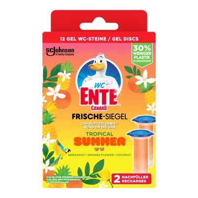 Die WC ENTE Frische Siegel Nfg. Trop. Summer sorgt für ein stets sauberes und duftendes WC. Mit jeder Spülung reinigt sie hygienisch und effektiv, während die Anti-Kalk-Wirkung auch hartnäckige Ablagerungen verhindert. Bis zu 700 Spülungen oder etwa 8 Wochen lang hält der angenehme Duft an. Zudem ist das Produkt mikroplastikfrei und lässt sich ganz einfach anwenden. Vertraue auf die Qualität von WC ENTE!