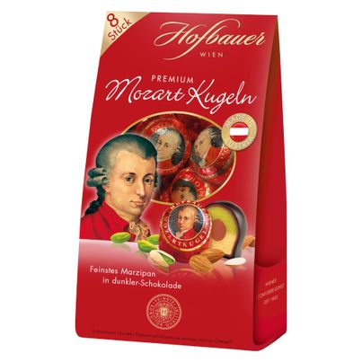 Hofbauer - Wiener Confiserie Kunst seit 1882. Feinste Mozartkugeln aus dem Hause Hofbauer - eine Wiener Klassiker. Palmölfrei und ideal für alle dich sich und Ihre Liebsten verwhönen möchten. Im praktischen Beutel mit 8 Kugeln Inhalt.