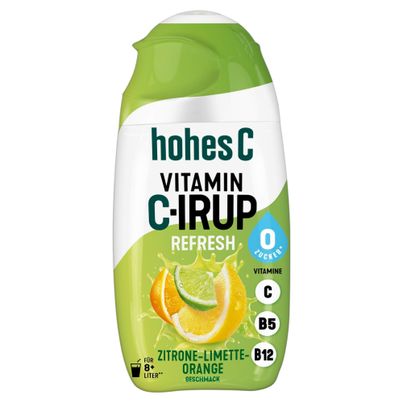 Unser hohes C Vitamin C-IRUP Refresh, mit dem Geschmack von Limetten, Orangen und Zitronen, versorgt dich mit wichtigen Vitaminen und hilft dir täglich mehr Wasser mit Fruchtgeschmack zu trinken. Die Vitamine C, B5 und B12 unterstützen dich in deiner mentalen Leistungsfähigkeit. Durch die Verwendung von Süßstoffen ist unser zubereitetes C-IRUP-Getränk zucker- und kalorienfrei. Eine Flasche hohes C Vitamin C-IRUP ergeben bis zu 8 Liter leckeres Fertiggetränk - bei einem Mischverhältnis von 2ml Sirup (2x drücken) auf 248ml Wasser (1 Glas). Eine ausgewogene Ernährung und gesunde Lebensweise werden empfohlen.