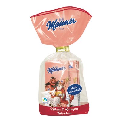 Die Manner Nikolo & Krampus Täfelchen bringen festliche Freude in die Adventszeit. Mit zarter Vollmilchschokolade und liebevoll gestalteten Motiven sind sie ein Highlight für Kinder. Perfekt als kleines Geschenk oder zum Naschen zwischendurch. Lagere sie trocken und bei Zimmertemperatur.