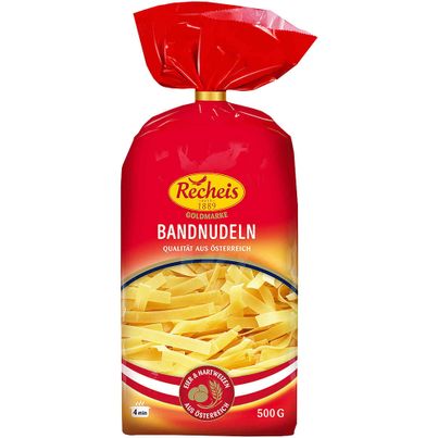 Recheis Goldmarke Bandnudeln bieten dir 500g puren Genuss. Die Kombination aus bestem Hartweizengrieß, frischen Eiern aus kontrollierter Bodenhaltung und reinem Tiroler Wasser sorgt für ein unvergleichliches Geschmackserlebnis. Ob als Beilage zu Fleisch oder als Hauptgericht mit deiner Lieblingssauce – diese Bandnudeln sind die perfekte Wahl für abwechslungsreiche Hausmannskost.