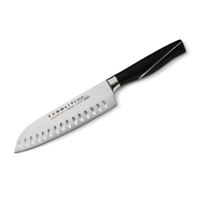 Darüber hinaus sorgen die Vertiefungen in der Klinge (Kullenschliff) für einen geringeren Widerstand beim Schneiden und reduzieren gleichzeitig das Anhaften von Schnittgut. Aufgrund seiner Balance und der einfachen Handhabung und Schnittführung ist dieses Messer vor allem bei Einsteigern und Hobbyköchen beliebt. Der schwarze, ergonomisch geformte Kunststoffgriff sorgt für gute und sichere Handhabung und überzeugt durch außergewöhnlich ansprechendes Design und Haptik. Klinge und Griff sind fugendicht und unlösbar miteinander verbunden. Die TYROLIT LIFE Iceline Messerserie wird in enger Zusammenarbeit mit dem Tiroler Werkzeugexperten Stubai hergestellt. Sämtliche Messer bestechen durch ihre überragende Verarbeitungsqualität und Langlebigkeit. Die rostfreien Klingen sind aus einem Stück hochwertigstem Edelstahl (Stahlmaterial 1.4116) geschmiedet und durch mehrphasige Eishärtung mit einem hochwertigen Schutz gegen Korrosion versehen. Durch die perfekt abgestimmte Balance zwischen Klinge und Griff liegen die Messer optimal in der Hand. Die spülmaschinenfesten Materialien entsprechen selbstverständlich sämtlichen geltenden Lebensmittel- und Hygienegesetzen. Ein professionelles Messer sollte sich in jeder gut sortierten Küche finden. Denn es erlaubt die Zubereitung der unterschiedlichsten Speisen und trägt zu einer feinen sowie schonenden Zerkleinerung von Lebensmitteln bei. Als ein vielseitiges Universalmesser, das sich sowohl bei Einsteigern als auch bei Hobbyköchen großer Beliebtheit erfreut, hat sich das sogenannte Santokumesser bewährt. Der Name des ursprünglich aus Japan stammenden Kochmessers leitet sich aus den beiden Wörtern "San" und "Toku" ab, wobei die Übersetzung etwa "drei Tugenden" entspricht. Bedenkt man in diesem Zusammenhang, dass sich Fleisch, Fisch und Gemüse mit einem Santokumesser mühelos schneiden lassen, erscheint der Name umso passender. Neben ihrer Vielseitigkeit sind Santokumesser insbesondere für ihre kompromisslose Schärfe bekannt. Der Name richtet sich dabei nach der speziellen Klingenform, die im Japanischen als "Santoku" bezeichnet wird. Die Allzweckküchenmesser verfügen über eine sehr scharfe Klinge, die mit einer stumpfen Oberkante einhergeht. Der Verlauf der Oberkante und der Griff des Messers bilden eine gerade Linie. Die scharfe Klinge fällt des Weiteren sehr breit aus, sodass sie den Messergriff deutlich überragt. Diese spezielle Klingenform hat den Vorteil, dass das Messer bei Schnittarbeiten gut in der Hand liegt und gleichzeitig einen sicheren Schutz für die Finger bietet. Während reguläre Fleischmesser teilweise recht schwer ausfallen können, verfügt ein Santokumesser über ein geringes Gewicht. Die äußerst scharfen Allzweckmesser sind vor allem auf den sogenannten Druckschnitt ausgelegt und bieten eine optimale Balance zwischen Klinge und Griff. Die Besonderheit eines Santokumessers liegt in der speziellen Klinge, die über einen sogenannten Kullenschliff verfügt. Sie fällt zwar äußerst breit aus, zeigt sich gleichzeitig aber auch sehr dünn. In Kombination mit einem sehr hohen Schärfegrad erlaubt das Allzweckmesser feinste Schnitte.