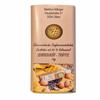 Diese handgeschöpfte, in Österreich produzierte Confiserieschokolade wird in Kleinmengen hergestellt und erfüllt allerhöchste Qualitätsansprüche. Der oftmals prämierte Schokolikör für die Füllung stammt aus hauseigener Produktion unter Verwendung der hofeigenen Hühnereier und zarter Schokolade.