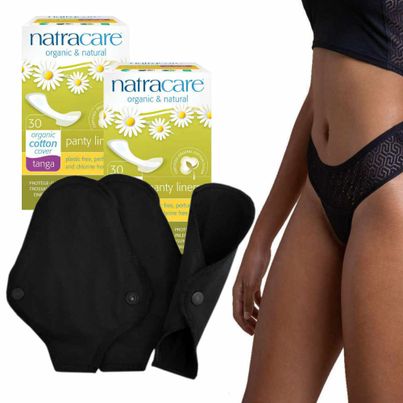 Setinhalt: 1 Stück Cocoro Periodenslip Moeri Tanga, 3er Pack Stoffslipeinlagen Tanga aus Bio-Baumwolle sowie 2 Packungen Natracare Bio-Slipeinlagen Tanga