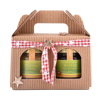 Geschenkpackung mit zwei Gläsern schmackhaftem Bio-Honig in den Sorten Blüten- mit Waldhonig und Cremehonig im dekorativem Karton, gestaltet passend zur Weihnachtszeit, ideal als kleines Geschenk für Honigliebhaber und solche, die es noch werden wollen.