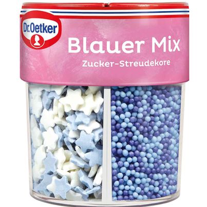 Dr. Oetker's Blus Mix is ideally suited for boys and basically for all super heroes. The blue and white decor is a true highlight on your pastry. The sprinkle decor mix contains the following: Sprinkles in blue and white, sugar stars in blue and white, drug-free beads in various shades of blue and light blue sugar pearls.