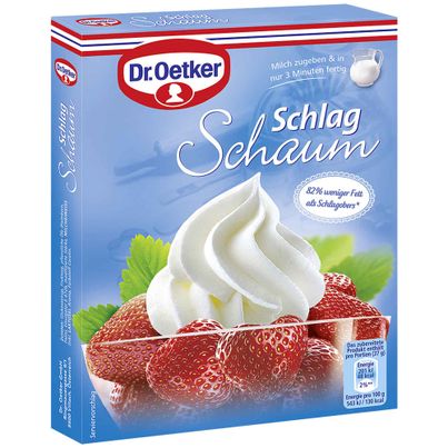 Dr. Oetker Whipped Foam is a delicious and calorie-reduced alternative to whipped cream for it contains 82% less fat than unsweetened whipped cream (36% fat). Dr. Oetker Whipped Foam can easily be kept in stock and prepared by adding milk.