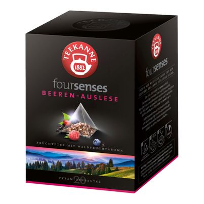 Teekanne's Foursenses Berry Selection Tea offers you an incomparable taste experience. The hand-picked berries unfold their full aroma in each pyramid tea bag, providing an intense wild berry flavor. The transparent, aroma-sealed packaging guarantees freshness with every infusion. Whether you enjoy the tea hot on a cold winter evening or as a refreshing iced tea in the summer, the combination of hibiscus, apples, rosehips, and a selection of berries such as blackberries, blueberries, raspberries, and elderberries offers a harmonious taste experience.
