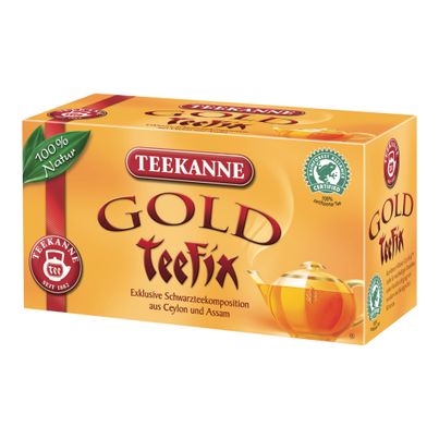 Gold Teefix from Teekanne offers you an exquisite black tea blend from the renowned tea-growing regions of Ceylon and Assam. This blend combines the robust, malty notes of Assam tea with the finer, aromatic nuances of Ceylon tea. Ideal for everyday enjoyment or as a special treat during the festive season. A preparation tip: Let the tea bag steep in freshly boiled water for 3-5 minutes to develop the full aroma. The tea is vegan and pairs perfectly with a piece of cake or a light breakfast. Whether as a warming companion on cold winter days or as a refreshing iced tea in summer, Gold Teefix offers you versatile moments of enjoyment. Store the tea bags in a cool, dry place to preserve their freshness and quality. With Gold Teefix from Teekanne, you experience the perfect balance of tradition and taste.