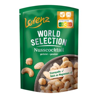 Lorenz's roasted and salted nut cocktail offers a delicious blend of premium cashews, blanched hazelnuts, and almonds. This combination is not only a treat for the palate, but also a valuable contribution to your diet. High in vitamin E and magnesium, this snack supports your health and vitality. The nuts are carefully roasted in sunflower and peanut oil and refined with a pinch of salt to enhance their natural flavor.