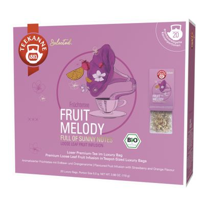 Organic Fruit Melody fruit tea from Teekanne offers you a harmonious blend of sun-ripened, natural fruits. The fruity flavor of strawberries and oranges unfolds in each biodegradable pyramid tea bag. Enjoy 100% organic quality with every sip.