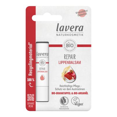The Organic Lip Balm Repair from Lavera Naturkosmetik pampers your lips with the power of organic pomegranate and organic argan oil. Chapped and dry lips receive intensive care and become soft and supple. The vegan formula with natural ingredients provides lasting protection and moisture.
