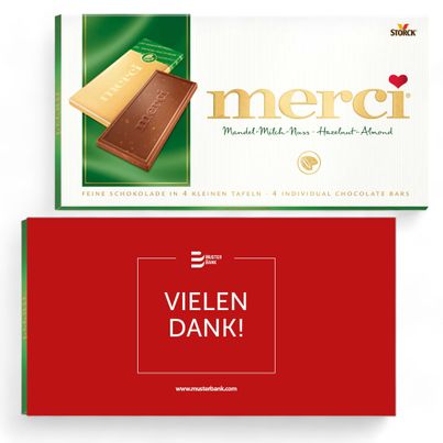 Personalised Merci Almond-Milk-Nut 100g with cardboard slipcase is available to buy in increments of 15