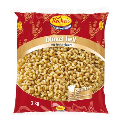Recheis Spelt 2-Egg Horns, Ribbed, 3000g, offer a delicious change on your plate. These ribbed spelt horns absorb sauces perfectly and provide an intense flavor experience. Containing 10% free-range eggs from Austria, they're a high-quality choice for your kitchen.
