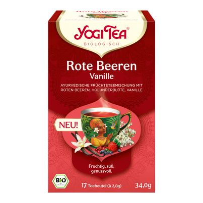 Yogi Tea Rote Beeren Vanille vereint köstliche Aromen in einer ayurvedischen Früchteteemischung. Mit Hibiskus, Holunderblüten und einer feinen Vanillenote bietet dieser Tee ein harmonisches Geschmackserlebnis für Körper, Geist und Seele. Ideal für eine entspannende Auszeit, vegan und ohne Gentechnik – gönn dir diesen besonderen Genuss!