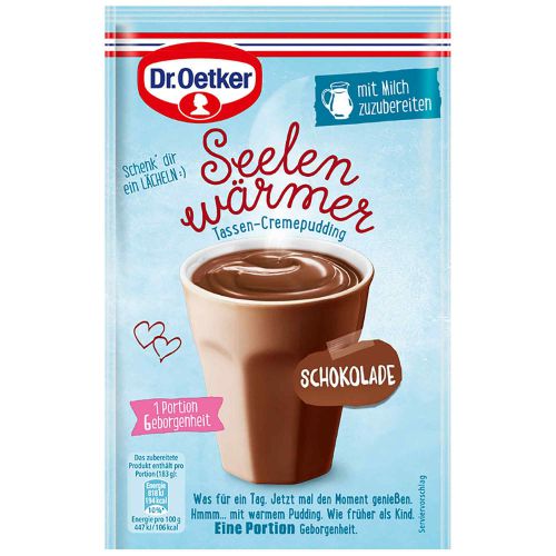 Der Dr. Oetker Seelenwärmer Schokolade ist der ideale Begleiter für kleine Genussmomente. In kürzester Zeit zauberst du dir einen warmen, cremigen Schokoladen-Pudding, der mit seinem intensiven Geschmack für Gemütlichkeit sorgt. Einfach das Puddingpulver in eine Tasse geben, mit 150 ml heißer Milch oder Wasser aufgießen, kräftig umrühren – und schon kannst du genießen. Perfekt für eine kleine Auszeit, als süßer Snack oder als schneller Nachtisch für zwischendurch.