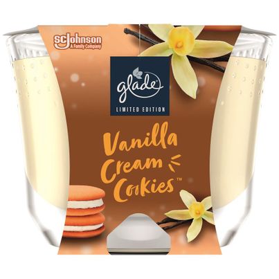 Die Duftkerze Vanilla Festive Kiss von Glade (BY BRISE) bringt eine warme und einladende Atmosphäre in dein Zuhause. Mit ihrem verführerischen Vanilleduft sorgt sie für ein Gefühl von Gemütlichkeit und Geborgenheit. Diese Kerze ist ideal für die kalte Jahreszeit, wenn du es dir drinnen so richtig gemütlich machen möchtest.