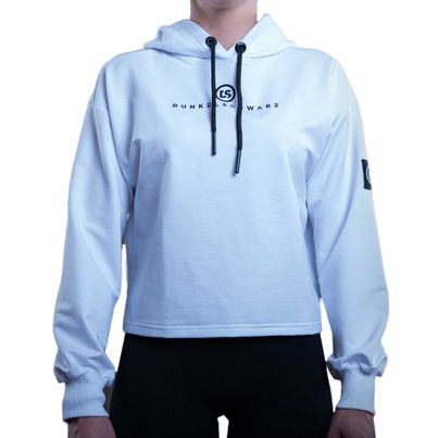 Damen-Kapuzensweater oversize, cropped style. Unser bauchfreier Hoodie ist DAS COOLE Fashion-Outfit. Dieses Modell zeigt den typischen Roll-up Druck “DS-Icon + DUNKELSCHWARZ” vorne auf der Brust