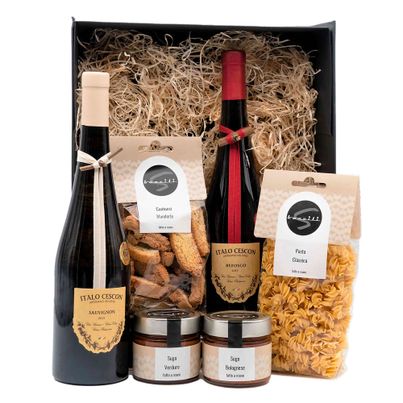 Die Lebensfreude in Italien ist legendär und sie hat viel mit der köstlichen regionalen Küche zu tun. Mit dieser Geschenkbox holen Sie sich einzigartige Genussmomente nach Hause. In der Box sind Classica Pasta und dazu das passende Sugo sowie zwei italienische Weine als Begleitung und zum süßen Abschluss Cantucci.