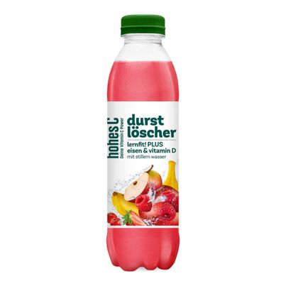 | Zutatenliste | Wasser, Mehrfruchtsaft aus Fruchtsaftkonzentraten (Apfel 38%, Acerola 2%, Zitrone) Schwarzkarottenkonzentrat 4%, Erdbeermark 3%, Himbeermark 2%, Bananenmark 1%, Eisen-II-Gluconat, Vitamin D. |
