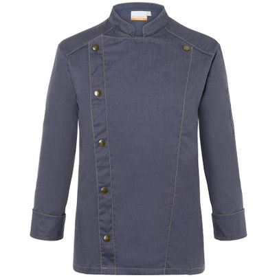 Die Kochjacke Jeans vintageblack von KARLOWSKY PASSION vereint Stil und Funktionalität. Ihre schlanke Silhouette und die kontrastfarbigen Steppnähte sorgen für einen authentischen Jeans-Look. Mit der asymmetrischen Knopfleiste und den praktischen Druckknöpfen bist du schnell einsatzbereit. Die Ärmelmanschetten mit Schlitz bieten zusätzlichen Komfort. Perfekt für moderne Küchenprofis!