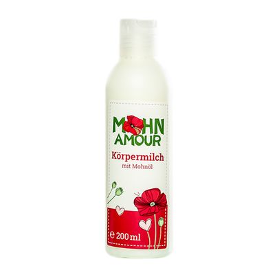 Unsere Mohn Amour – Körpermilch mit hochwertigem Mohnöl ist für die tägliche Hautpflege geeignet. Die Körpermilch wird mit Mohnöl, Avocadoöl und Nussöl angereichert. Macht Ihre Haut seidenweich und spendet Feuchtigkeit. Ideal zur Pflege der trockenen Haut.