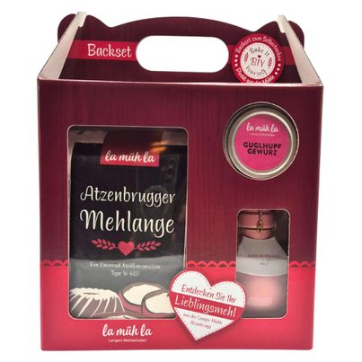 Das Kuchen Geschenkbox Backset von Langer Mühle ist die perfekte Geschenkidee für Kuchenliebhaber und Hobbybäcker. Mit 1 kg Atzenbrugger Mehlange, 50g la müh la Gugelhupfgewürz und einer Rose de Rouges Brut Sektbombe zauberst du im Handumdrehen köstliche Kuchen. Die beiliegende Rezeptkarte inspiriert zu neuen Kreationen. Ideal für besondere Anlässe wie Ostern oder Weihnachten.