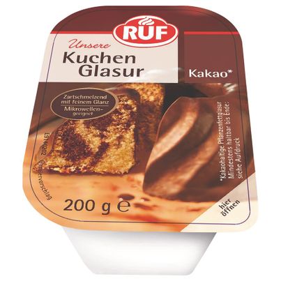 RUF Kuchenglasur Kakao verleiht deinem Gebäck oder Kuchen die perfekte Schokoladennote. Nach dem Erwärmen in der Mikrowelle oder im Wasserbad lässt sich die Glasur mühelos auftragen und sorgt für einen glänzenden, appetitlichen Abschluss. Ideal für kreative Backprojekte und ein Must-Have für jede Küche!