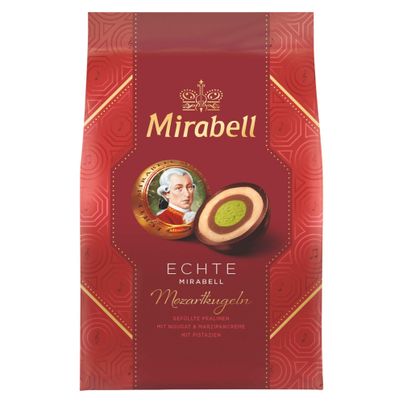 Entdecke die Mirabell Mozartkugel Säckchen 8 Stück 114g - Mit einem Kern von feinstem Mazipan aus Pistazien umhüllt von dunkler und heller Nougatcreme sowie zartherber Edelschokolade.