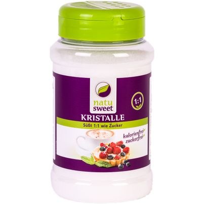 Natusweet Kristalle 1:1 Süße, zuckerfrei, kalorienfrei – 0 Kalorien. Die Kristalle süßen 1:1 wie Zucker. da die Tafelsüße auf der Grundlage von Erythritol und Steviolglycosiden basiert. Es ist bis zu 180 Grad C hitzebeständig und Ideal für eine bewusste Ernährung. 100 g Natusweet schmecken wie 100g Zucker
