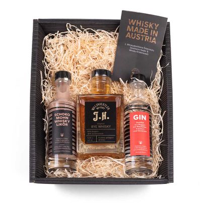 Geschenkbox mit 0,35l Rye Whisky, 0,1l Gin und 0,1l Schoko-Mohn-Whiskylikör