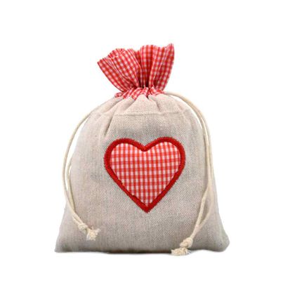 Zirbenduftsäckchen mit Herzmotiv, Größe ca.18x13 cm. Leinensackerl befüllt mit duftenden Zirbenflocken, mit Zugband, Farbe:natur/rot-karo.